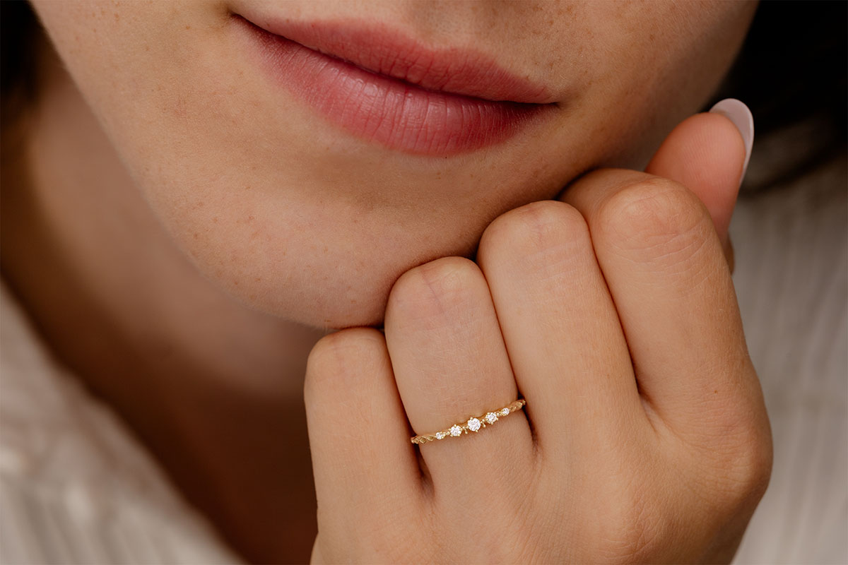 Pięć misternie oprawionych diamentów zdobi obrączkę, lśniąc blaskiem i finezyjnymi detalami.Wyrafinowana i subtelna biżuteria, która rozświetli każdy dzień.
