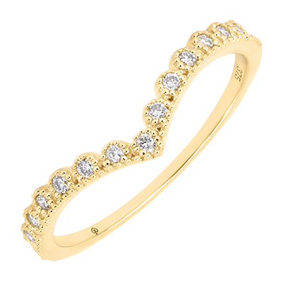 Trzynaście diamentów tworzy linię w kształcie litery V, podkreślając krzywiznę palca blaskiem i precyzją.Olśniewająca, geometryczna obrączka stworzona, by podkreślić pierścionek zaręczynowy lub zachwycać samodzielnie.