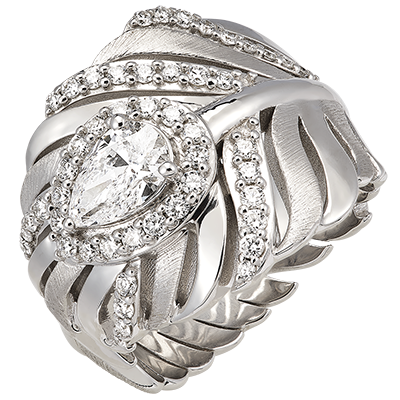 Pierścionek Impériale z 9-karatowego białego złota, z 49 syntetycznymi diamentami, jest wyrazem wirtuozerii przepychu i estetyki kolekcji Panache. Umieszczony pośrodku 0,5-karatowy diament w kształcie gruszki prezentuje się niezwykle okazale.