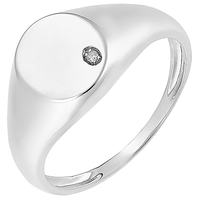Sygnet z białego złota, pośrodku z owalną podstawą oprawioną okazałym połyskującym diamentem. Zdecydowanie nowoczesny model.