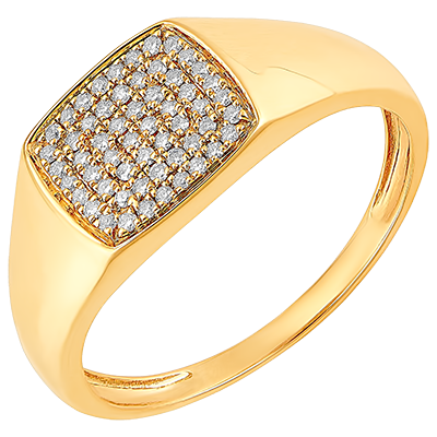 Sygnet z żółtego złota z beczkowatą podstawą pośrodku, bogato oprawiony 56 diamentami.