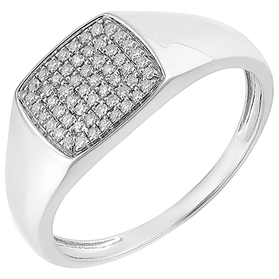 Sygnet z białego złota, z beczkowatą podstawą pośrodku, bogato wysadzany 56 diamentami.