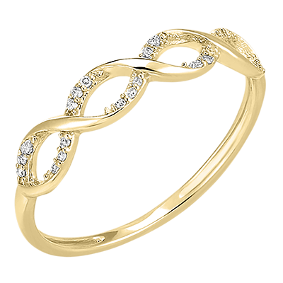 Pierścionek z przeplatającymi się pasmami z mieniącymi się brylantami w oprawie z żółtego złota.