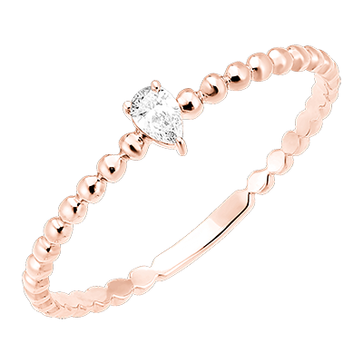 Pierścionek Pojedyncza gruszka wyróżnia się delikatnym diamentem o szlifie gruszki osadzonym na szynie z różowego złota przypominającej swym kształtem ciąg połączonych kuleczek, co nadaje mu odrobinę nowoczesnego szyku.