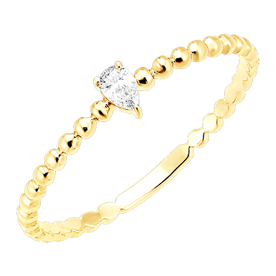 Pierścionek Pojedyncza gruszka wyróżnia się delikatnym diamentem w kształcie gruszki osadzonym na szynie z żółtego złota przypominającej swym kształtem ciąg połączonych kuleczek, co nadaje mu odrobinę nowoczesnego szyku.