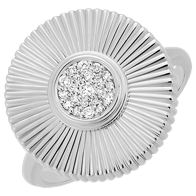 Pierścionek z białego złota, przypominający swym kształtem słońce poprzez swój promienisty design i centralnie umieszczony klaster diamentów. Nowoczesna interpretacja bogactwa, która idealnie pasuje do rozświetlenia codziennego stroju.