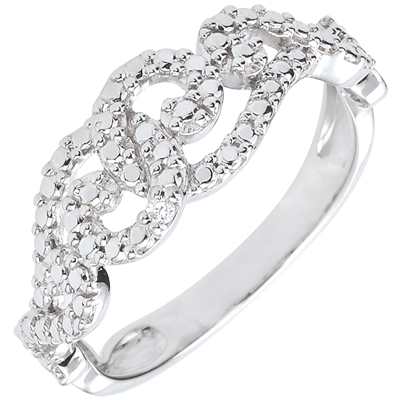Oryginalny pierścionek z przeplatanych arabesek z białego złota wysadzanych diamentami.