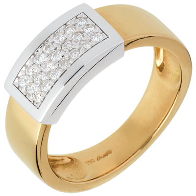 Prosta i graficzna oprawa z charakterem, stanowiąca połączenie złota żółtego i białego, podkreślona diamentami. Pierścionek wyrażający więź i zuchwałość