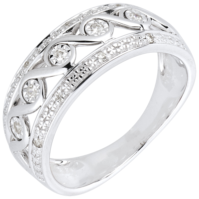 Szereg diamentów w zwoju z białego złota otoczonych oprawą ze złotymi stemplami dającymi bardzo błyszczący efekt.