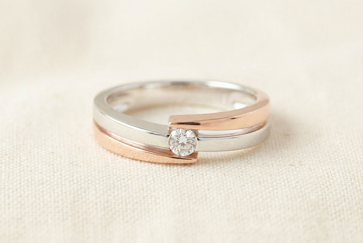 Pojedynczy diament jest oprawiony w obrączce z białego złota otoczonej dwoma ramionami z różowego złota.