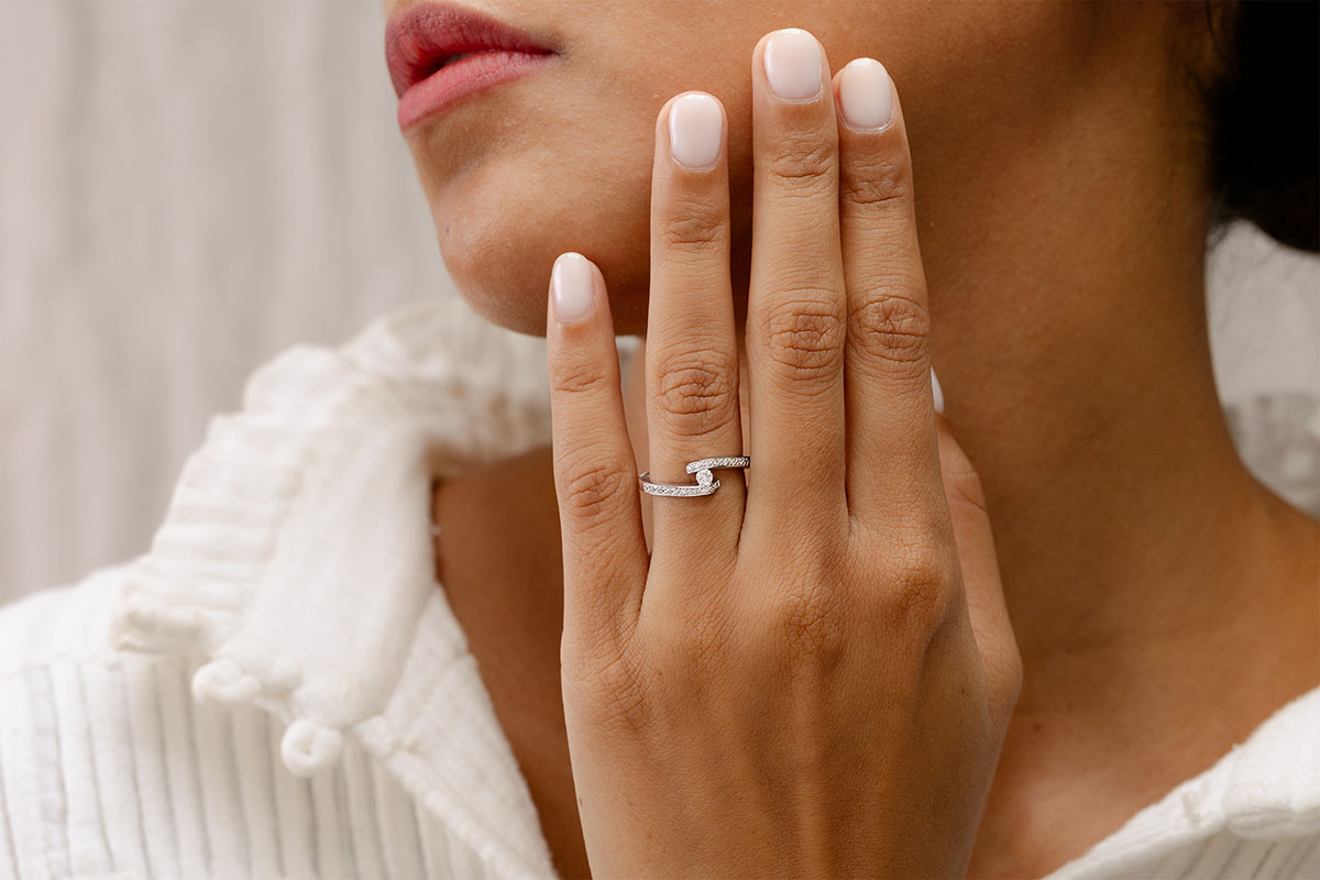 Białe złoto usiane diamentami w dynamicznej odsłonie jako oprawa dla wspaniałego pojedynczego diamentu 0,08 karata.
