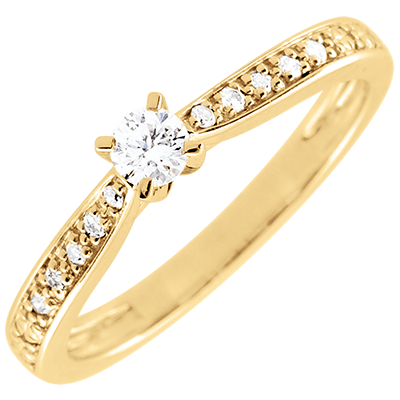 Diament środkowy w ośmiu krapach na wyrafinowanej obrączce usianej diamentami.