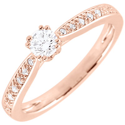 Diament środkowy w ośmiu krapach na wyrafinowanej obrączce usianej diamentami.