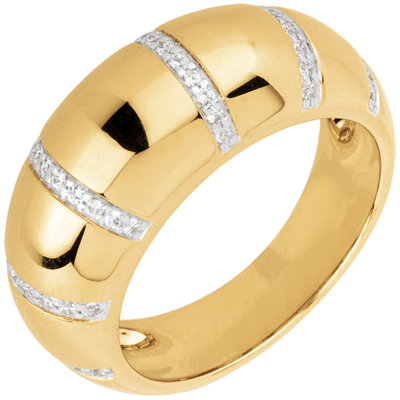 Subtelne linie oprawy diamentów na zaokrąglonej obrączce z żółtego złota.