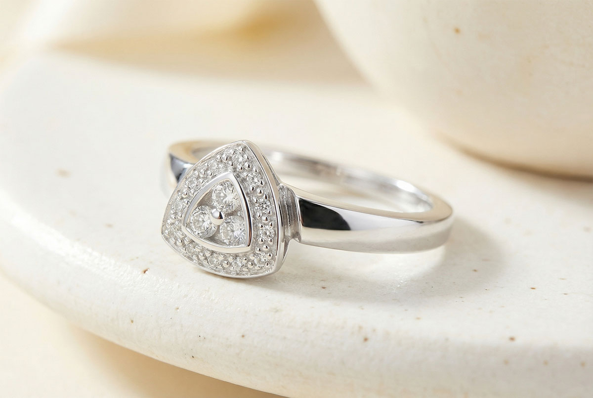 Bardzo elegancki trójkątny pierścionek ze złota i diamentów ozdabiający kobietę jak gwiazdę kinową.
