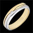 - Szeroka, dwukolorowa obrączka z białego i żółtego złota 9K o unikalnym wyglądzie