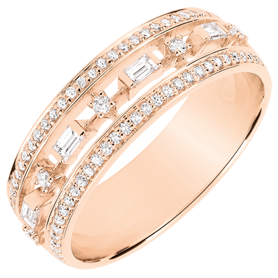 Elegancja i osobowość w pierścionku, który olśniewa wyjątkową naprzemiennością brylantów i diamentów o szlifie „bagieta” w różowym złocie. Obrączka „bagieta” jest bardziej oryginalna niż obrączka wysadzana kamieniami o szlifie „bagieta”, a jednocześnie zachowuje swoją ponadczasowość.