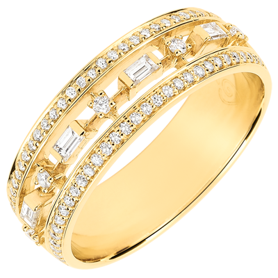 Elegancja i osobowość w pierścionku, który olśniewa wyjątkową naprzemiennością brylantów i diamentów o szlifie „bagieta” w żółtym złocie.
