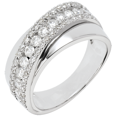 Obrączka bogato zdobiona diamentami krąży wokół szerokiej obrączki z białego złota.