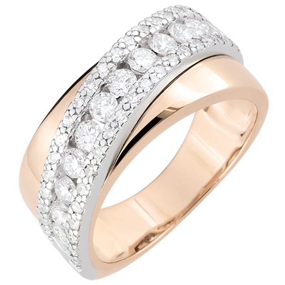 Obrączka bogato zdobiona diamentami krąży wokół szerokiej obrączki z różowego złota.