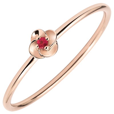 Rozwarte płatki delikatnej małej róży z różowego złota ukazujące na wieki środek z rubinu.