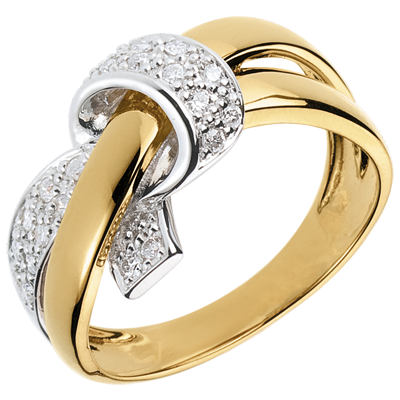 Podwójna obrączka z żółtego złota przekształca się w węzeł z białego złota i diamentów.