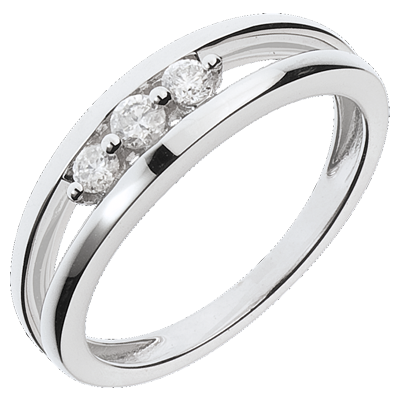 Trzy diamenty umieszczone w szczelinie między dwoma obrączkami z białego złota. Pierścionek o czystej formie