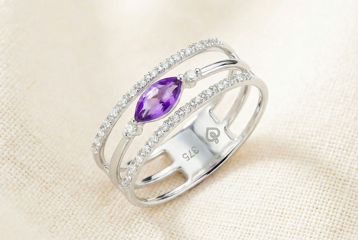 Jak dwie kunsztowne powieki linie ze złota i diamentów chronią cenną źrenicę, którą symbolizuje łezka z ametystu. Wyrafinowany pierścionek do noszenia na co dzień lub na wyjątkowe okazje.