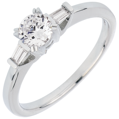 Pojedynczy diament elegancko uzupełniony dwoma diamentami o szlifie „bagieta”.