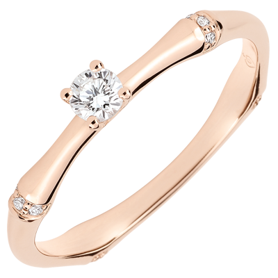 Elastyczna i trwała bambusowa tyczka przeobrażona w wieczny pierścionek zaręczynowy. Złączenia bambusa są wysadzane diamentami osadzonymi w różowym złocie dla podkreślenia diamentu środkowego.