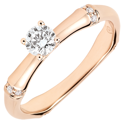 Elastyczna i trwała bambusowa tyczka przeobrażona w wieczny pierścionek zaręczynowy. Złączenia bambusa są wysadzane diamentami osadzonymi w różowym złocie dla podkreślenia diamentu środkowego.