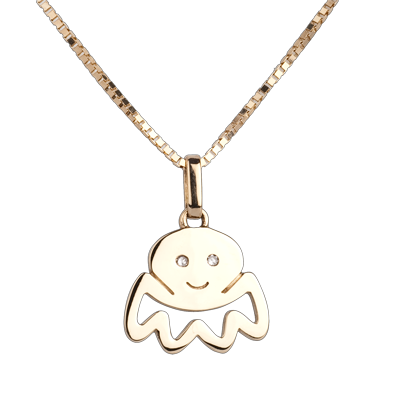 Mała ośmiorniczka z żółtego złota o ażurowych mackach uśmiecha się oczami z diamentów. Duży model.