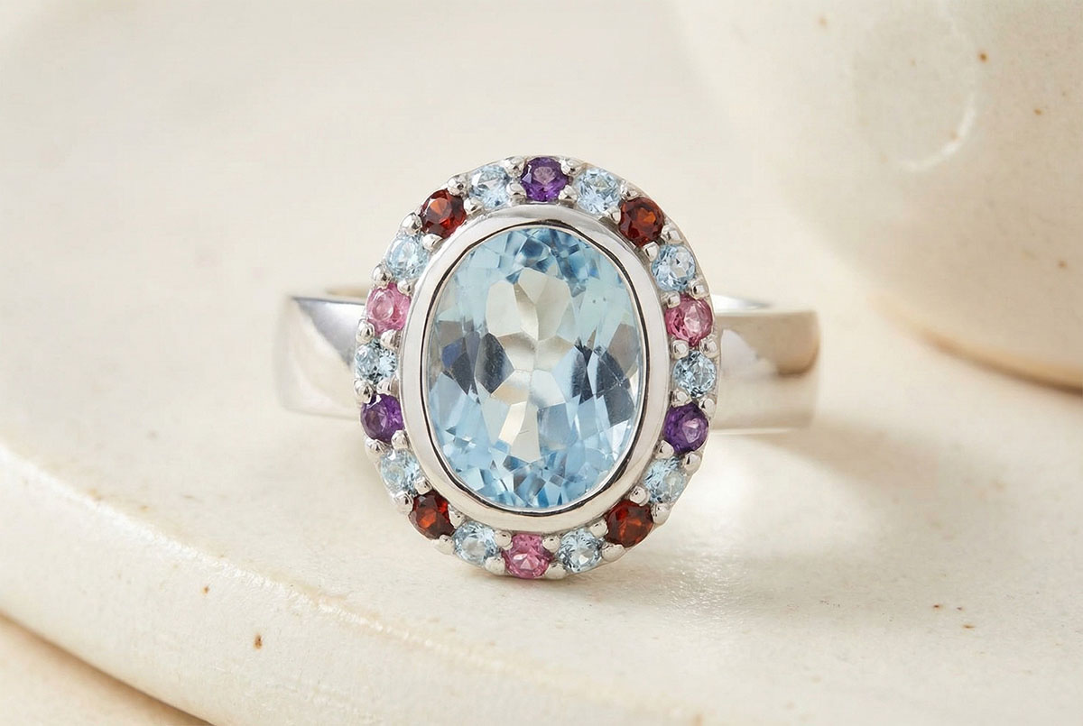 Margerytka z kamieni ozdobnych o śmiałej kompozycji: niebieski topaz na środku otoczony różowymi turmalinami, topazami, ametystami i granatami. Ożywcza świeżość i kobiecość.