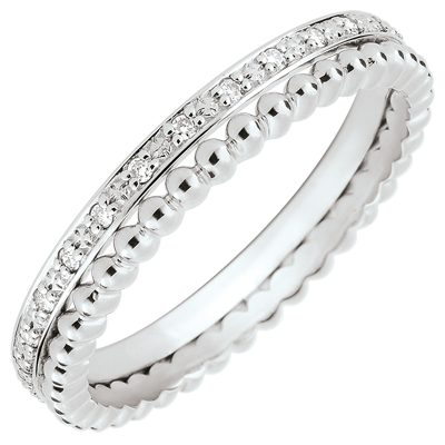 Obrączka z białego złota wysadzana diamentami łączy się z obrączką ze złotych pereł w delikatnym duecie. Klasyczna i oryginalna kobieca obrączka.