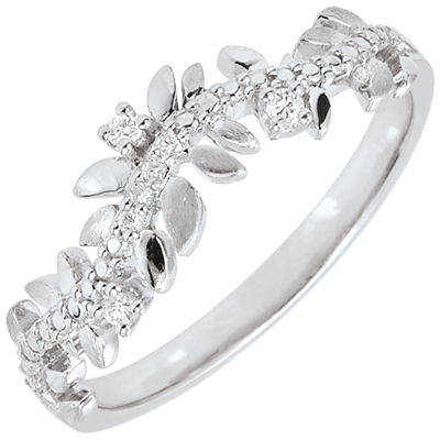 Romantyczny pierścionek wysadzany 7 diamentami, wykonany naprzemiennie z błyszczących liści z białego złota i z liści ze złota szczotkowanego ręcznie.
