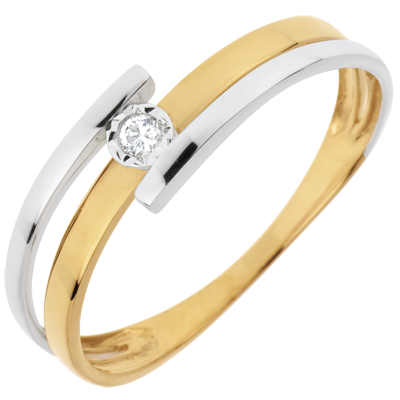 Pierścionek Pocałunek z jednym diamentem - złoto białe i złoto żółte 18-karatowe