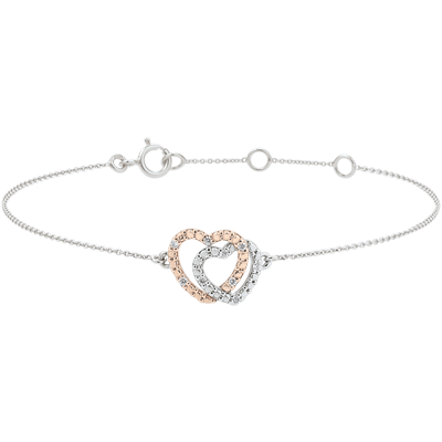 Ten wyjątkowy element biżuterii, ozdobiony dwoma splecionymi sercami z drobiazgowo wykonanym białym i różowym złotem, symbolizuje czułość i bliskość