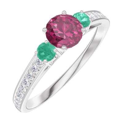 « L'ATELIER » Nº160688Pierścionek Białe złoto 375 - Rubin okrągły 0.3 karat - Kamienie boczne Szmaragd - Oprawa Diament 4.5