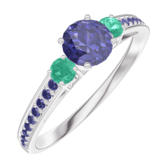 « L'ATELIER » NR 161296Pierścionek Białe złoto 375 - Niebieski szafir okrągły 0.3 karat - Kamienie boczne Szmaragd - Oprawa Niebieski szafir 4.5