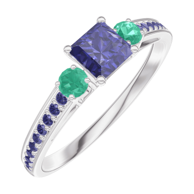 « L'ATELIER » NR 161396Pierścionek Białe złoto 375 - Niebieski szafir „Księżniczka” 0.3 karat - Kamienie boczne Szmaragd - Oprawa Niebieski szafir