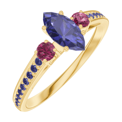 « L'ATELIER » NR 161754Pierścionek Żółte złoto 375 - Niebieski szafir Markiza 0.3 karat - Kamienie boczne Rubin - Oprawa Niebieski szafir
