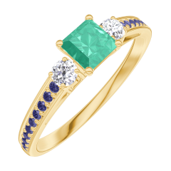 Pierścionek Żółte złoto 750 - Szmaragd „Księżniczka” 0.3 karat - Kamienie boczne Diament - Oprawa Niebieski szafir