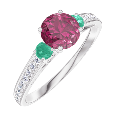 « L'ATELIER » Nº163088Pierścionek Białe złoto 375 - Rubin okrągły 0.5 karat - Kamienie boczne Szmaragd - Oprawa Diament 4.5