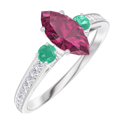 « L'ATELIER » Nº163587Pierścionek Białe złoto 750 - Rubin Markiza 0.5 karat - Kamienie boczne Szmaragd - Oprawa Diament