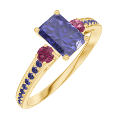 Pierścionek Żółte złoto 375 - Niebieski szafir Prostokąt 0.5 karat - Kamienie boczne Rubin - Oprawa Niebieski szafir