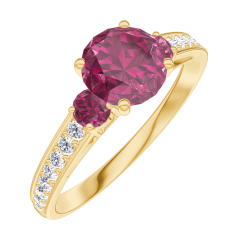 Pierścionek Żółte złoto 750 - Rubin okrągły 0.7 karat - Kamienie boczne Rubin - Oprawa Diament