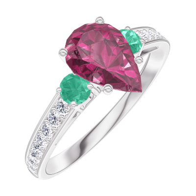 « L'ATELIER » Nº165887Pierścionek Białe złoto 750 - Rubin Gruszka 0.7 karat - Kamienie boczne Szmaragd - Oprawa Diament