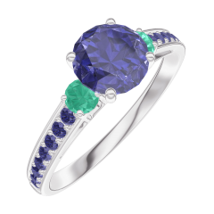 « L'ATELIER » NR 166096Pierścionek Białe złoto 375 - Niebieski szafir okrągły 0.7 karat - Kamienie boczne Szmaragd - Oprawa Niebieski szafir 4.9