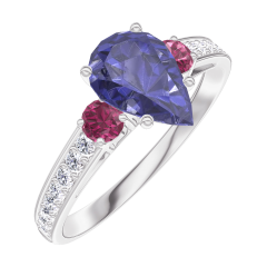 Pierścionek Białe złoto 375 - Niebieski szafir Gruszka 0.7 karat - Kamienie boczne Rubin - Oprawa Diament
