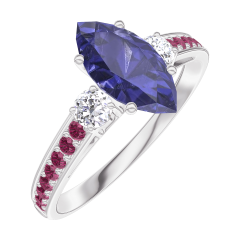 Pierścionek Białe złoto 750 - Niebieski szafir Markiza 0.7 karat - Kamienie boczne Diament - Oprawa Rubin